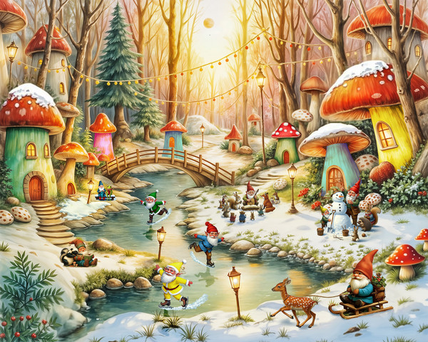 Step into a magical winter wonderland with this charming gnome village puzzle. Featuring skating gnomes, snow-covered cottages, and festive forest details, this cozy holiday puzzle offers a heartwarming challenge for all ages.