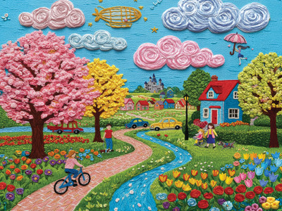 95In this stitch of time, spring comes alive. This charming village scene blooms with color and texture. Flowering trees, bright blossoms, and a winding stream bring the landscape to life. Neighbors stroll and a cyclist glides along a sunny path. Embroidered-style details add depth and warmth. Springbok’s uniquely shaped puzzle pieces create a fun, satisfying 1000-piece challenge.