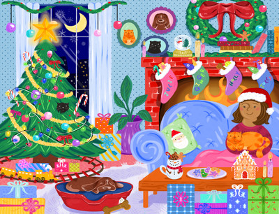 Unwrap the warmth of the holidays! A glowing tree, stockings, sweet treats, and a cuddly cat create a colorful, joyful living room scene that’s pure Christmas comfort.