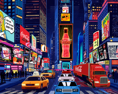 Coke takes over. A vibrant city night ignites with glowing Coca-Cola signs, speeding traffic, and illuminated towers. Every detail bursts with brand nostalgia and big-city excitement.